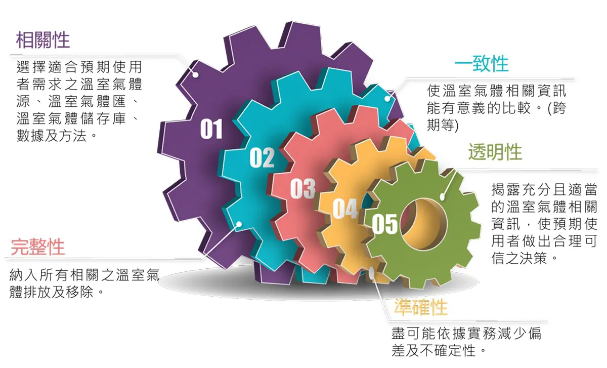 依循 ISO 14064-1,企業可發展並落實溫室氣體管理政策與目標,建構符合國際規範的盤查流程,涵蓋組織邊界、營運邊界及各類排放源鑑別,並進行數據量化與不確定度分析。其核心精神建立在五大盤點原則: